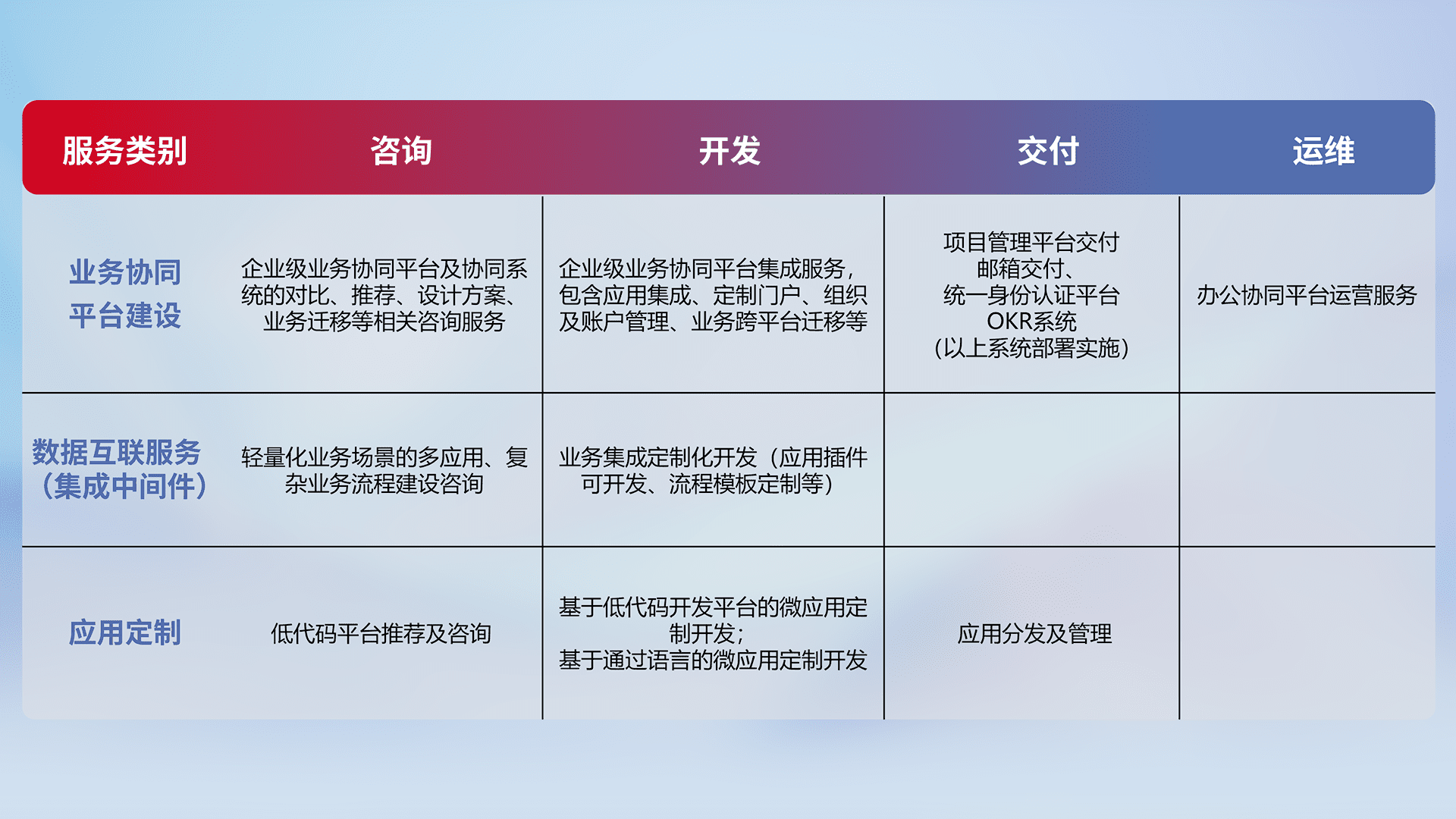 针对钉钉、、企微、、、、IDaas等平台级产品提供产品的规划、、、、方案、、、、交付、、定制化开发等服务,,,实现如统一协同办公、、智能客户服务、、、、混合会议管理、、智能数据查询、、、、等业务场景,,,,实现数字化转型。。。。