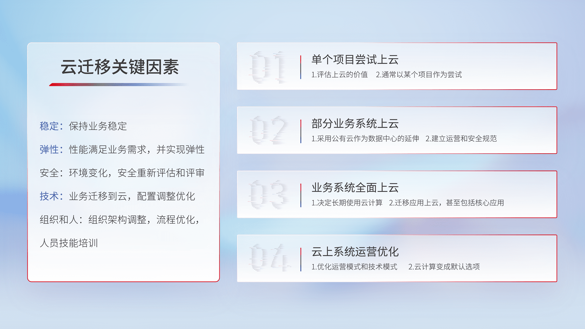 结合实际业务,,,,从规划设计、、、云平台选型、、、云原生改造、、数据迁移、、、、集成交付,,,迁移全过程为客户识别最佳上云路径,,,做好风险识别管理,,,设计网络架构、、、、身份权限、、安全审计合规、、、、操作审计、、、、日志审计、、、监控告警策略、、多站点容灾设计等,,,对云上基础设施进行整体规划,,提升IT治理水平,,,,以满足弹性、、、高可用、、、、高性能的需求。。。